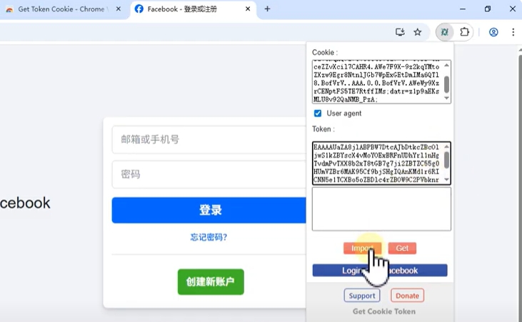 2,安装浏览器FB登录插件 https://chromewebstore.google.com/detail/get-token-cookie/naciaagbkifhpnoodlkhbejjldaiffcm?utm_source=item-share-cb